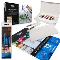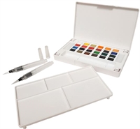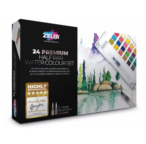 24 halvpan akvarelfarver – dette sæt kommer i en bærbar æske og indeholder ikke kun 24 levende farver, men også en blandepalette, 2 svampe og 2 genopfyldelige akvarelpensler.