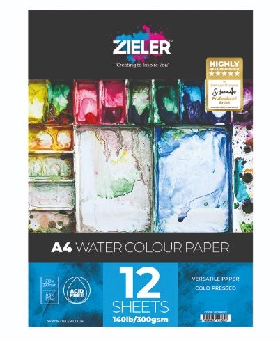 A4 akvarelblok – 12 ark tykt, let struktureret 300 g/m² papir i en A4-blok med limkant.