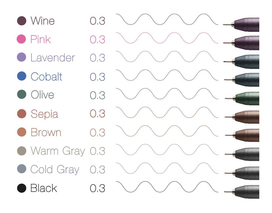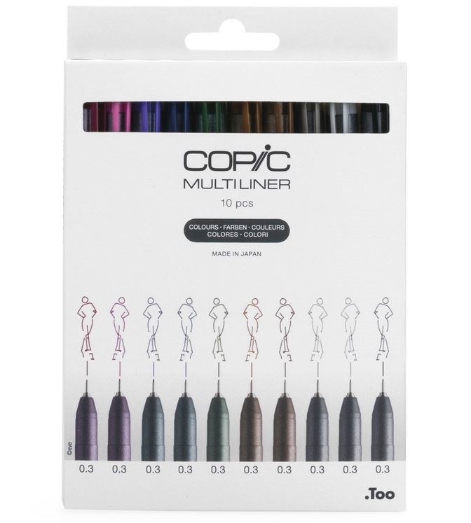 Sæt med 10 forskellige farver Copic Multiliner 0,3 mm. Finelinerne giver mulighed for ekstremt detaljeret arbejde og anvender pigmentbaseret, lysægte blæk, som er vand- og alkoholresistent. Blækket tværer ikke ud og falmer ikke, og blækflowet er ensartet, hvilket gør dem ideelle til alle former for skitsering og illustration. Fremstillet i Japan.