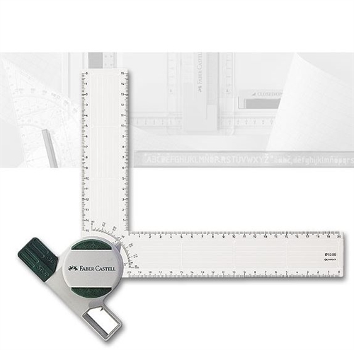 Auf Parallel-Lineal aufsetzbar und verschiebbar - voll nutzbarer Rechtwinkel - Markierstrich für Schraffierabstand - Arretiertaste - 90° Schwenkbereich - 15° Rasterung - 1° Feineinstellung