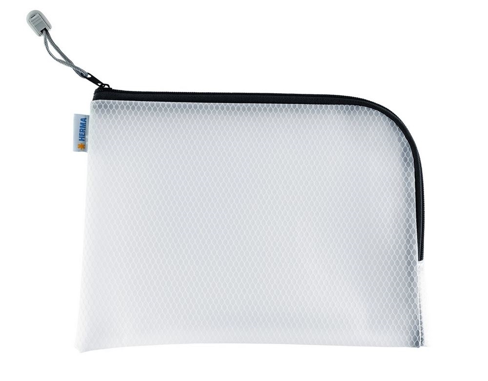 De semi-transparente HERMA universal lommer med praktisk lynlås er lavet af slidstærkt og robust mesh-stof. Indholdet er delvist synligt. Multiposer til opbevaring, indsamling, sortering og arkivering i hjemmet, på arbejdet og på farten. De er også ideelle til opbevaring af dokumenter, optegnelser og småting såsom kunsthåndværk, legetøj, skoledokumenter, kosmetik, toiletartikler og værktøj, elektronisk tilbehør, campingartikler... listen er uendelig. De er fleksible og robuste, men alligevel nemme at åbne og lukke. Lynlåsen løber ikke kun langs den ene side, den er også syet over hjørnet (hjørnelynlås). Det betyder, at tasken kan åbnes bredt, så selv større genstande nemt kan gemmes væk.