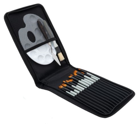 Kunstner penselsæt med 15 stk. Med palette og sort bæretaske med lynlås.