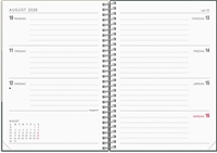 Ugekalender med en farvet forside. Kalenderen er spiralbundet med et omslag i tekstilpræg, som giver kalenderen et flot og enkelt udseende. Kalenderen er inddelt med en uge pr. opslag i tværformat, hvilket giver dig et overskueligt overblik over ugens aftaler og planer. Dertil finder du kvartalsoversigter, notatsider, lynopslag, praktiske informationer samt en lomme til løse papirer.