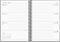 Ugekalender med en sort forside. Kalenderen er spiralbundet med et omslag i genbrugskarton, som giver kalenderen et flot og enkelt udseende. Kalenderen er inddelt med en uge pr. opslag i tværformat, hvilket giver dig et overskueligt overblik over ugens aftaler og planer. Dertil finder du kvartalsoversigter, notatsider, lynopslag, praktiske informationer samt en lomme til løse papirer.