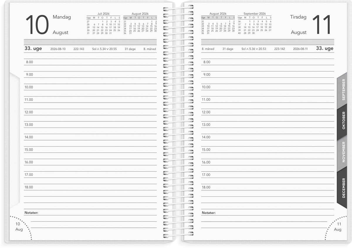Simpel dagskalender i et enkelt design. Kalenderen er spiralbundet med et omslag i PP-plast og har en grå forside med årstal. Basiskalenderen er inddelt med en dag pr. side og indeholder et timeopdelt kalenderskema fra kl. 8-18, så du nemt kan overskue dagens planer og aktiviteter. Dertil finder du plads til dagens noter nederst på hver side, en månedsoversigt ved hver måneds start samt afrivningshjørner, så du hurtigt og nemt kan slå op på dagens side.