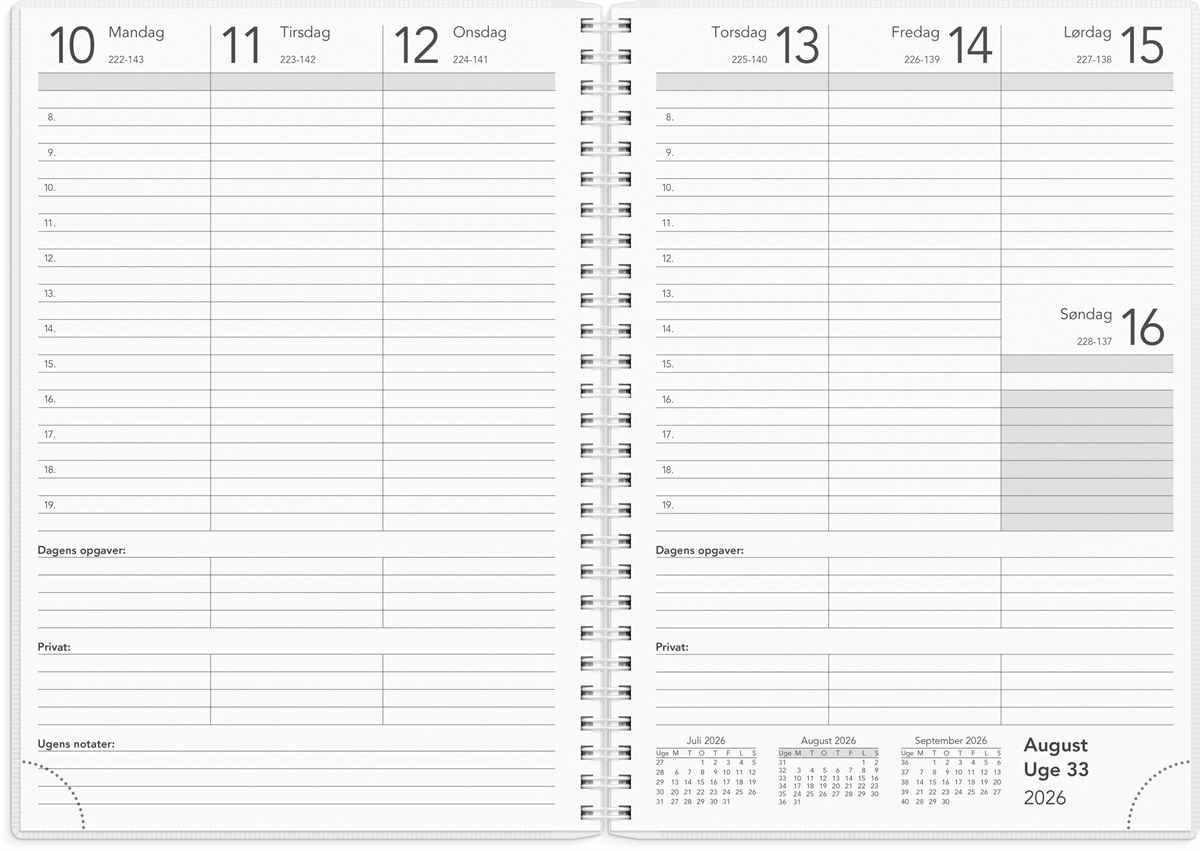 Simpel ugekalender i et enkelt design. Kalenderen er spiralbundet med et omslag i PP-plast og har en grå forside med årstal. Basiskalenderen er inddelt med en uge pr. opslag og indeholder et timeopdelt kalenderskema fra kl. 8-19, så du nemt kan overskue ugens planer og aktiviteter. Dertil finder du nederst på hver side plads til dagens opgaver, ugens notater, private aftaler og aktiviteter samt en lille 3 måneders oversigt.