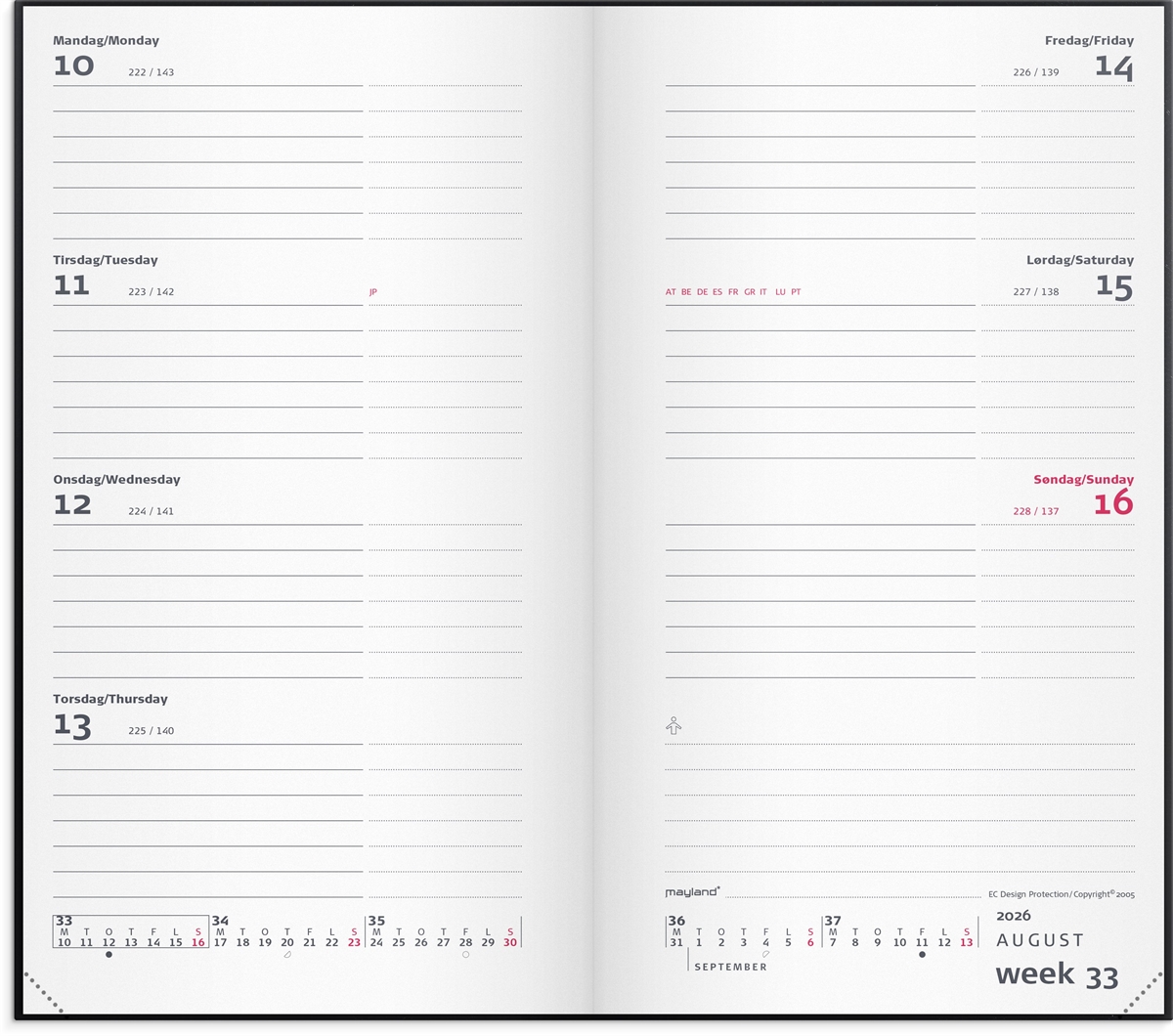 Format (udvendige mål på kalenderen): 17,3x10,2 cm