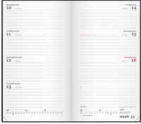 Eksklusiv, indbundet ugekalender. Kalenderen er indbundet med et omslag i sort vinyl, som giver kalenderen et flot og enkelt udseende. Kalenderen er inddelt med en uge pr. opslag og indeholder et funktionelt kalenderskema i moderne design, så du nemt kan danne dig et overblik over ugens planer og aktiviteter. Dertil finder du en tidslinje og en månedsoversigt nederst på hvert opslag, en udfoldelig årsoversigt, en informationsdel samt god plads til notater og aftaler.