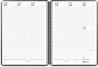 Kalenderen er spiralbundet og indbundet med et omslag i sort kunstskind, som giver kalenderen et elegant udseende. Kalenderen er inddelt med en uge pr. opslag og indeholder et funktionelt, overskueligt og timeopdelt kalenderskema fra kl. 8-18. Kalenderskemaet er designet med masser af linjer, så der er plads til at holde styr på ugens planer og aftaler. Dertil finder du en tidslinje og månedsoversigt nederst på hvert opslag, årsoversigter for tre år, særtjenestenumre og telefonselvvalg, adresse- og telefonregister samt et hæfte til fødselsdage og mærkedage indsat bagerst i en lomme.