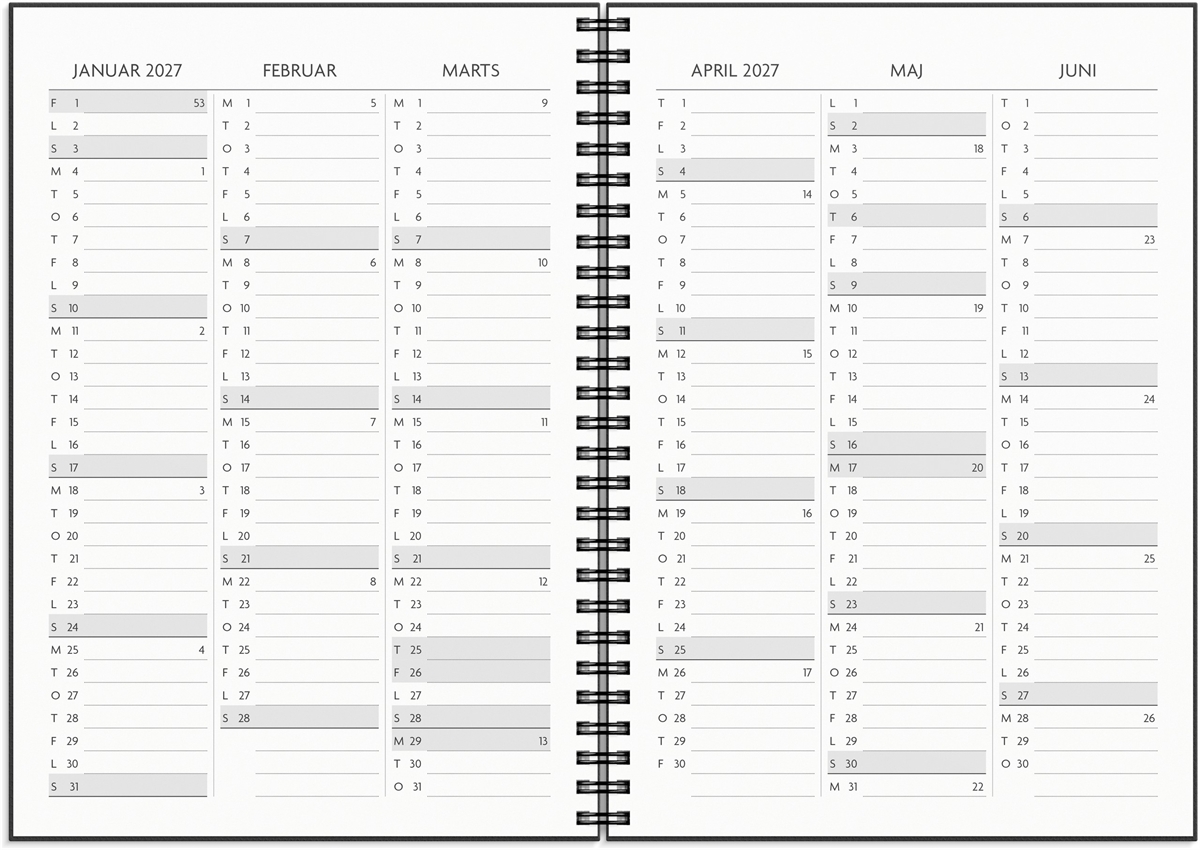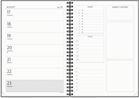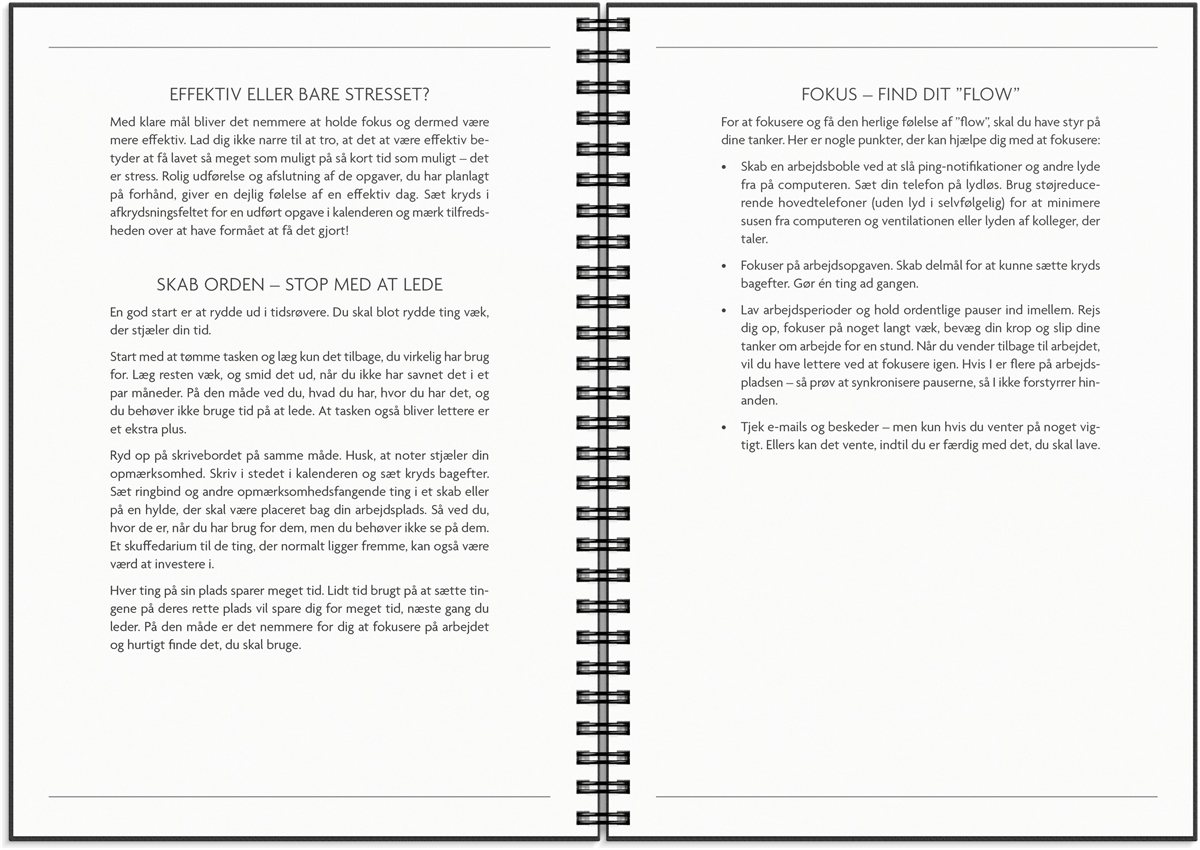 Smart og praktisk ugekalender, som hjælper dig med at få struktur på hverdagen. Kalenderen er til dig med mange aftaler, møder og arbejdsopgaver, som har brug for en kalender, der holder styr på det hele. Kalenderen er inddelt i uger med et kalenderskema i tværformat på venstre side og en side til tanker, idéer, opgaver og aftaler til højre. Kalenderopsætningen gør, at du slipper for en masse post it’s og påmindelser på telefonen – der er plads til det hele i kalenderen. Kalenderen er spiralbundet med et omslag i karton og en elastik, så kalenderen nemt holdes lukket. Desuden har kalenderen en lomme til løse papirer, et adresse- og telefonregister samt notatsider, så du har mulighed for at skrive længere tekster. Alt sammen elementer, der hjælper dig med at være mere effektiv.