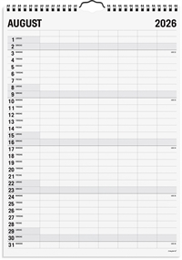 Familiekalender i sort/hvidt, stilrent design, der passer overalt. Kalenderen er inddelt med en måned pr. side. Hver måned er opdelt i 7 kolonner, så hvert familiemedlem har sin egen kolonne hver dag. På den måde kan du hurtigt og nemt skabe et overskueligt overblik over hele familiens aktiviteter og aftaler.