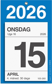 Afrivningskalender til vægophæng. Den smarte vægkalender har et praktisk blokformat, hvor hver side nemt kan rives af blokken, når dagen er gået. Afrivningskalenderen har et enkelt og moderne design med en blå baggrund og har bagsidetekster og et ugentligt krydsord.