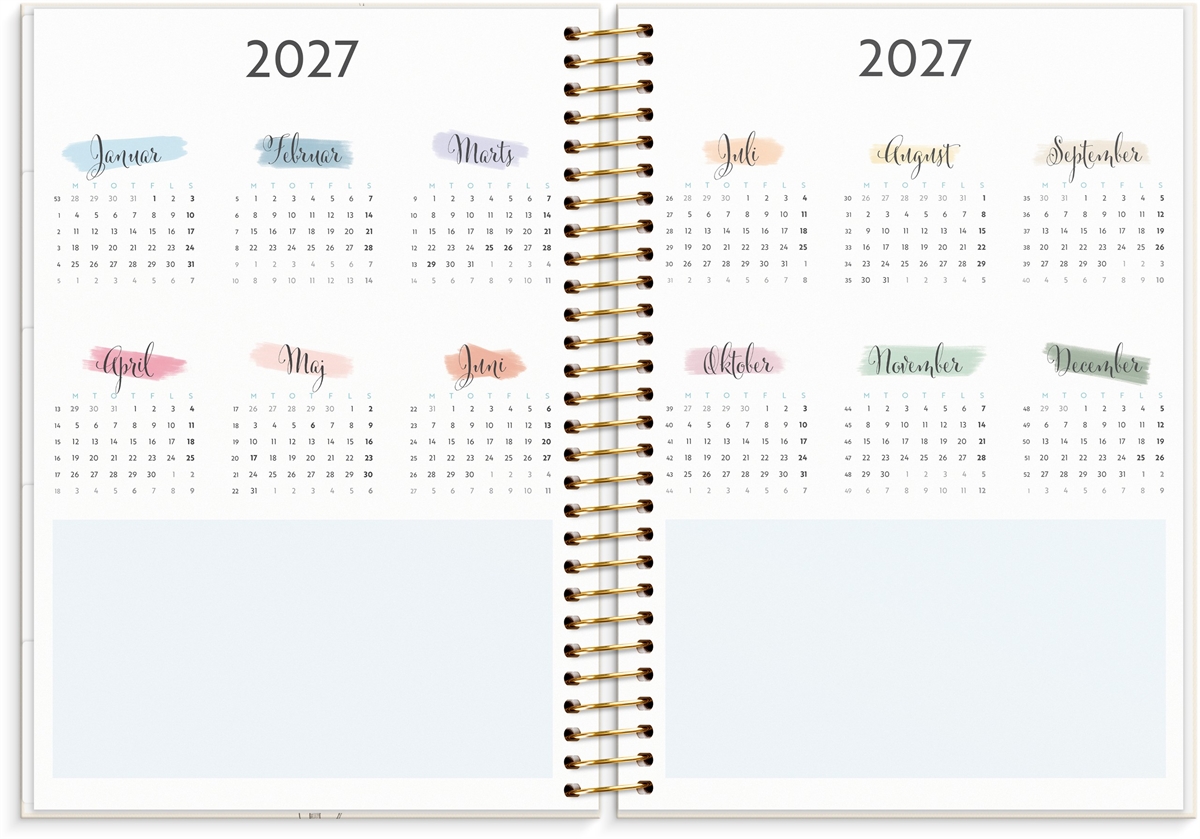 Kreativ life planner. Kalenderen er spiralbundet med et flot omslag i karton, hvilket giver kalenderen et stilrent udseende. Kalenderen er til dig, der sætter pris på at kunne planlægge din hverdag og have styr på dit liv. Du får rig mulighed for at lave egne lister og sætte kulør på din daglige planlægning. Skriv ugens planer ned, lav madplaner eller noter ugens højdepunkter. Du kan desuden let bladre mellem månederne via de farvelagte faneblade i fine pastelfarver. Kalenderen er opdelt med en uge pr. opslag og indeholder ugeopslag, månedsopslag, årsoversigter, notatsider samt 3 stickerark til at gøre planlægningen lettere og udseendet sjovere. Bagerst i kalenderen er der en smart lomme til løse papirer.