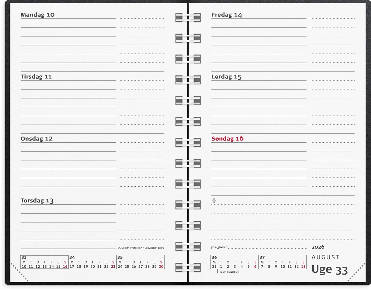 Lille ugekalender. Kalenderen er spiralbundet med et omslag i sort vinyl, som giver kalenderen et elegant udseende. Kalenderen er inddelt med en uge pr. opslag i tværformat, så du er er masser af plads til at notere ugens planer og aktiviteter. Nederst på hvert opslag finder du desuden en tidslinje og månedsoversigt, og alle sider er lavet med afrivningshjørner, så du nemt kan finde ud af, hvor du er nået til i kalenderen. Dertil finder du en udfoldelig årsoversigt samt en masse praktisk information.