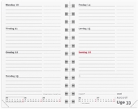 Refill til din mini ugekalender. Kalender-refillen er i tværformat og inddelt med en uge pr. opslag. Hver dag har et timeopdelt kalenderskema fra kl. 8-17, så du nemt kan danne dig et overblik over ugens planer og aktiviteter. Dertil finder du en tidslinje og månedsoversigt nederst på hvert opslag, en udfoldelig årsoversigt samt en masse praktisk information.