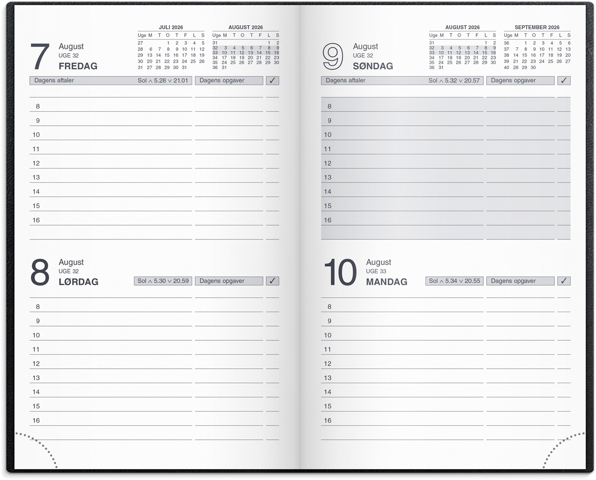 Smart noteringskalender. Kalenderen er indbundet med et omslag i kunstskind, som giver kalenderen et flot og elegant udseende. Kalenderen er inddelt med to dage pr. side og indeholder et klassisk, timeopdelt kalenderskema fra kl. 8-16, så du nemt kan danne dig et overblik over dagenes planer og aktiviteter. Dertil finder du månedsoversigter og en praktisk hjørneperforering, så du lettere kan holde styr på dagene.