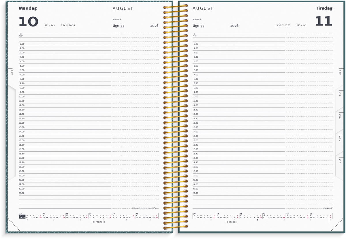 Timekalenderen er spiralbundet med et illustrativt omslag i soft touch, hvilket giver kalenderen et lækkert og moderne udseende. Kalenderen er inddelt med en dag pr. side og indeholder et timeopdelt kalenderskema kl. 0.00-23.00 og har en halvtimeinddeling i tidsintervallet 8-19. Dertil finder du en tidslinje og månedsoversigt nederst på hvert opslag, udfoldelig årsoversigter, speciel noteringskolonne, hjørneperforering og månedsregister, som sikrer hurtige opslag, samt en lomme til løse papirer bagerst i kalenderen.