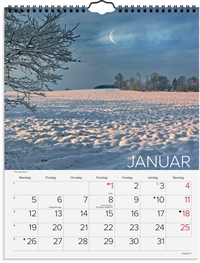 Vægkalender i karton med flotte billeder af dansk natur. Kalenderen er spiralbunden og giver dig en oversigt over 1 måned ad gangen med masser af plads til noteringer, så du hurtigt og nemt kan skabe et godt overblik over den enkelte måned.