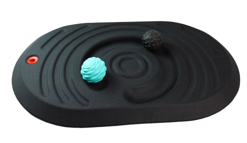 Aktiv ståmåtte med kurvet polyesterbetræk og 2 massagebolde, som aflaster fødder, knæ og ryg hos brugeren.
